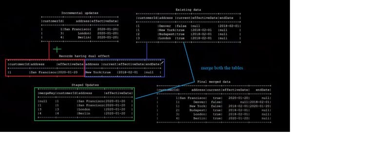 we are using merge_key column to get to know which record has dual effect lets say in our case customerId 1 has dual effect , so we must have two records from above query for customerId 1 , one with null to do insert in master table ans one with customerId as merge_key to do upsert.